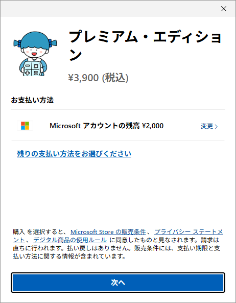 上記のような画面が表示されれば OK です。Microsoft Store の動作が改善しています。画面の表示に沿って購入手続きを進めてください。