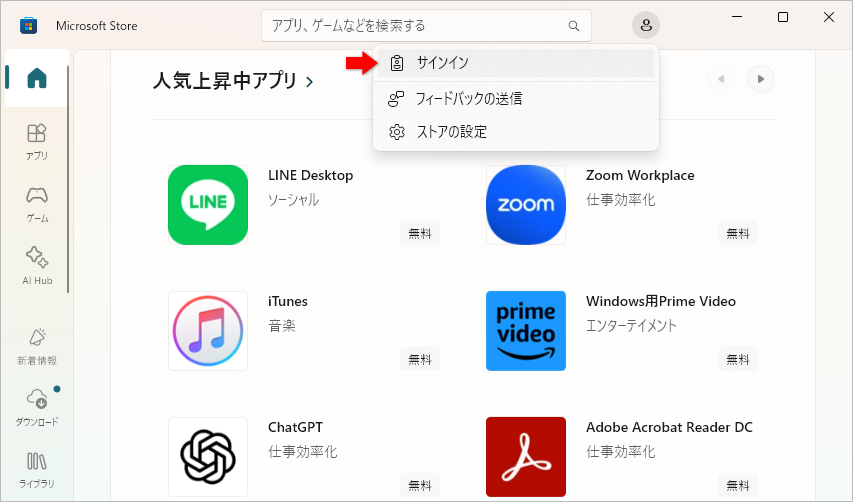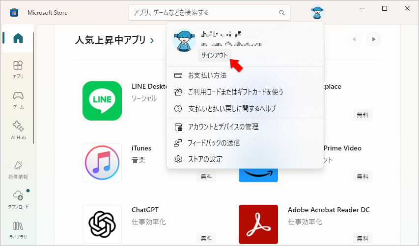 Microsoft Store を起動します。Microsoft Store にサインインしている場合は、 右上のアイコンを選択して 「サインアウト」 を押します。