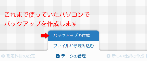 パソコンを買い替える際は、 これまでお使いの aoiro で 「データの管理」 → 「バックアップの作成」 を選択して、 入力データのバックアップ ・ ファイルを作成してください。