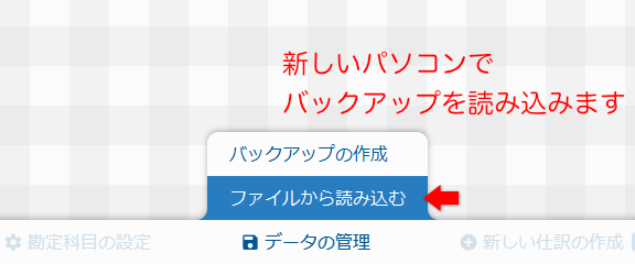 新しいパソコンにインストールした aoiro で 「データの管理」 → 「ファイルから読み込む」 を選択して、 コピーしたバックアップ ・ ファイルを開くと、 これまでの入力データを新しいパソコンに引き継ぐことができます。