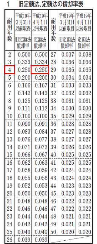 次に 「減価償却資産の償却率等表」 を参照して耐用年数 4 年の償却率を求めます。